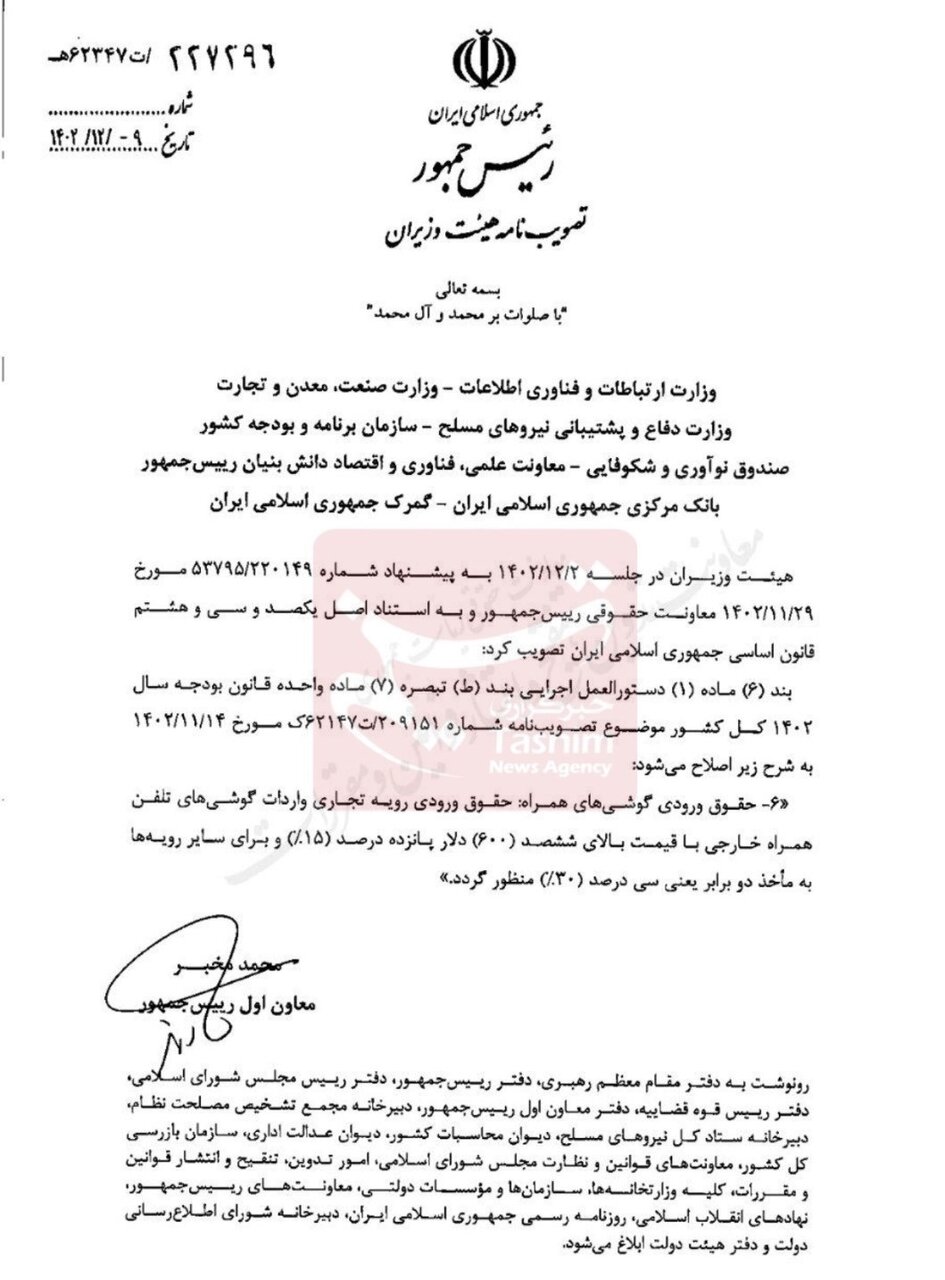 «۶- حقوق ورودی گوشیهای: همراه حقوق ورودی رویه تجاری واردات گوشی های تلفن همراه خارجی با قیمت بالای ششصد (۶۰۰) دلار پانزده درصد (۱۵٪) و برای سایر رویه ها به مأخذ دو برابر یعنی سی درصد (۳۰) منظور شود.»